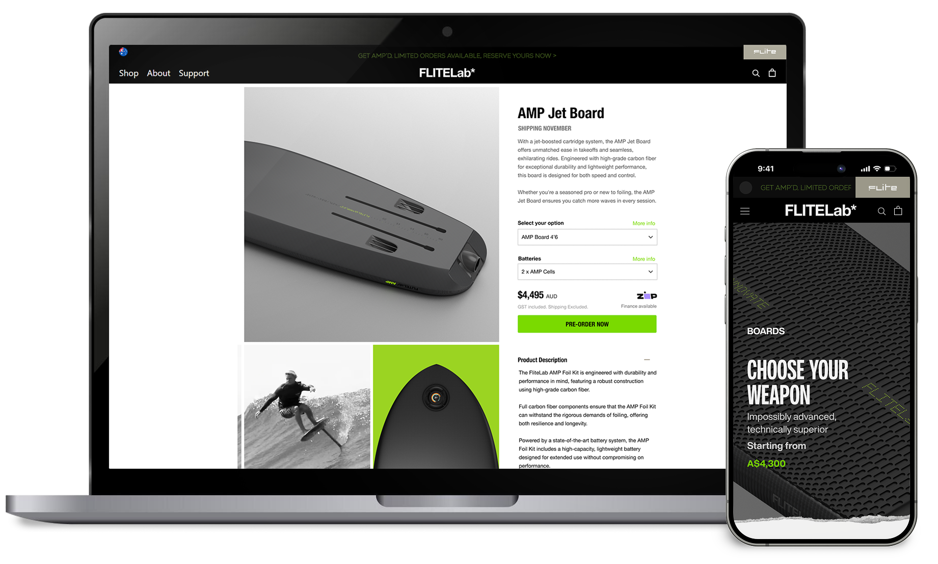 The website became the primary stage for this identity. It needed to clearly signal this was not Fliteboard, earn respect from experienced foilers, and position AMPJet as a genuine leap forward. Through rapid prototyping and iterative test and learn cycles, we built a digital experience showing real riders in real conditions - no studio gloss, just proof of capability.